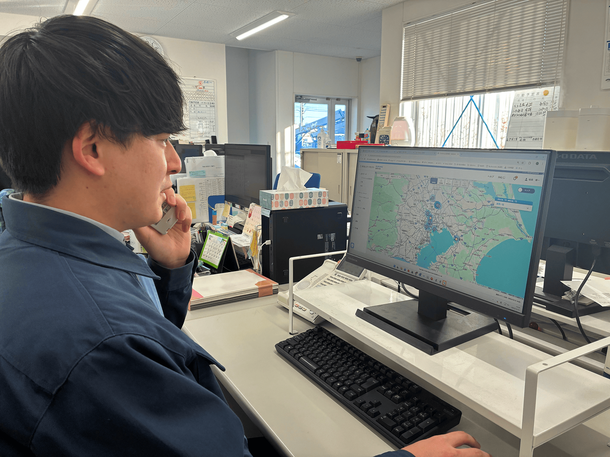 「リアルタイムで車両の位置を把握する手段がなく、現場一覧表を見て『どのナンバーの車が、誰が乗って、どこに行っているか』を一つひとつ確認していました。トラブル発生時や現場終了後、オペレーターに電話で現在地を確認する必要があり、タイムロスが生じていました」(森さん)